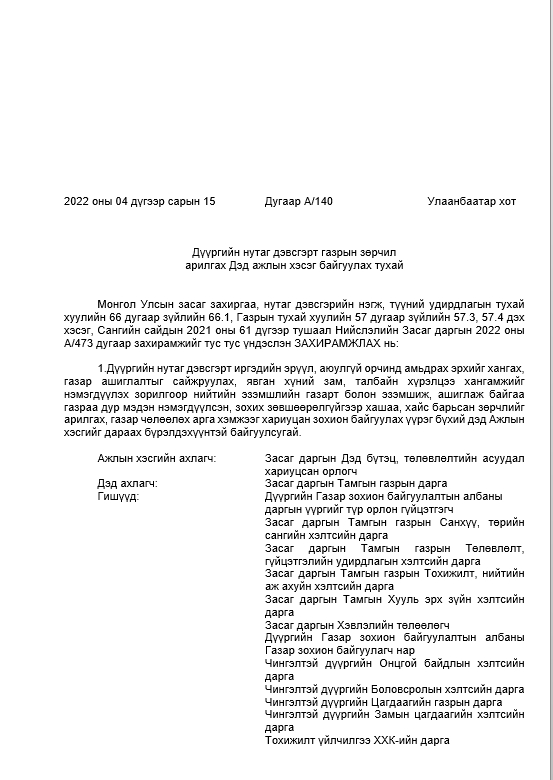 ДҮҮРГИЙН НУТАГ ДЭВСГЭРТ ГАЗРЫН ЗӨРЧИЛ АРИЛГАХ ДЭД АЖЛЫН ХЭСЭГ БАЙГУУЛАХ ТУХАЙ