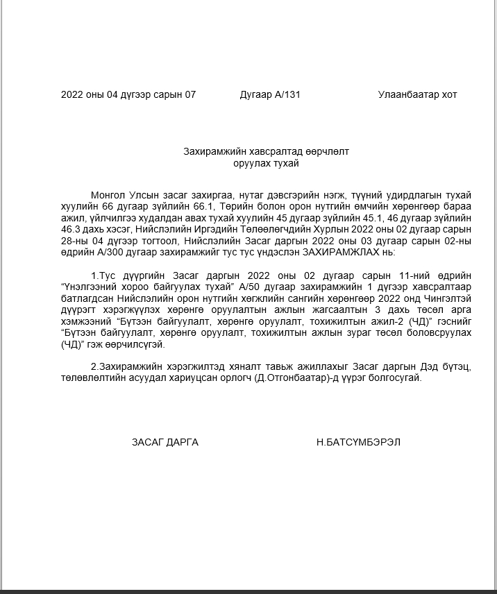 ЗАХИРАМЖИЙН ХАВСРАЛТАД ӨӨРЧЛӨЛТ ОРУУЛАХ ТУХАЙ