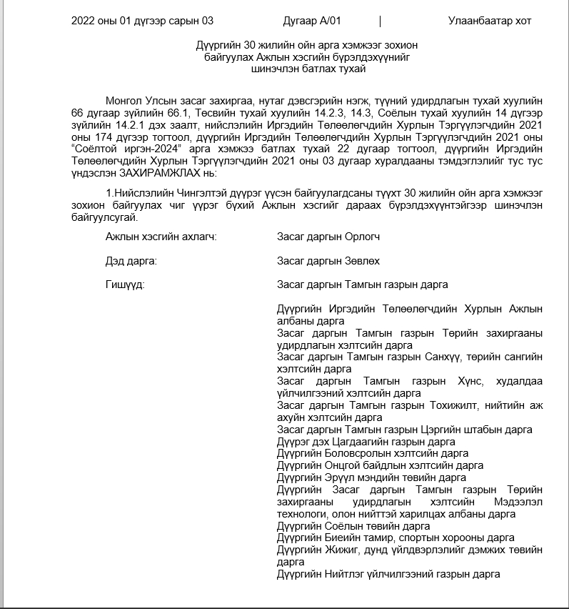 АЖЛЫН ХЭСГИЙН БҮРЭЛДЭХҮҮНИЙГ ШИНЭЧЛЭН БАТЛАХ ТУХАЙ