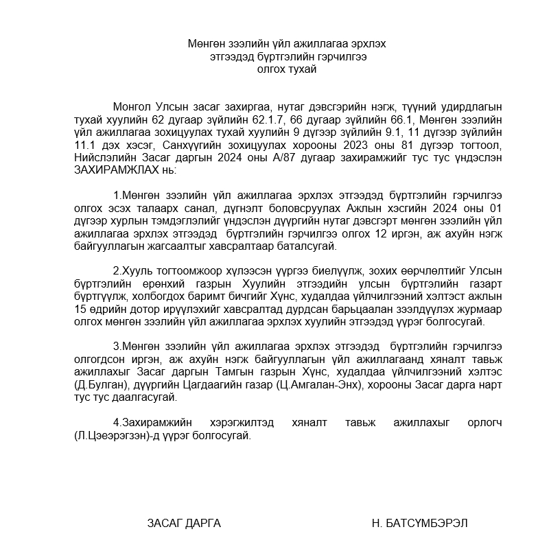 Мөнгөн зээлийн үйл ажиллагаа эрхлэх этгээдэд бүртгэлийн гэрчилгээ олгох тухай