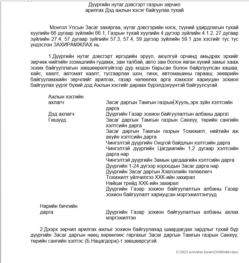 Дүүргийн нутаг дэвсгэрт газрын зөрчил арилгах Дэд ажлын хэсэг байгуулах тухай