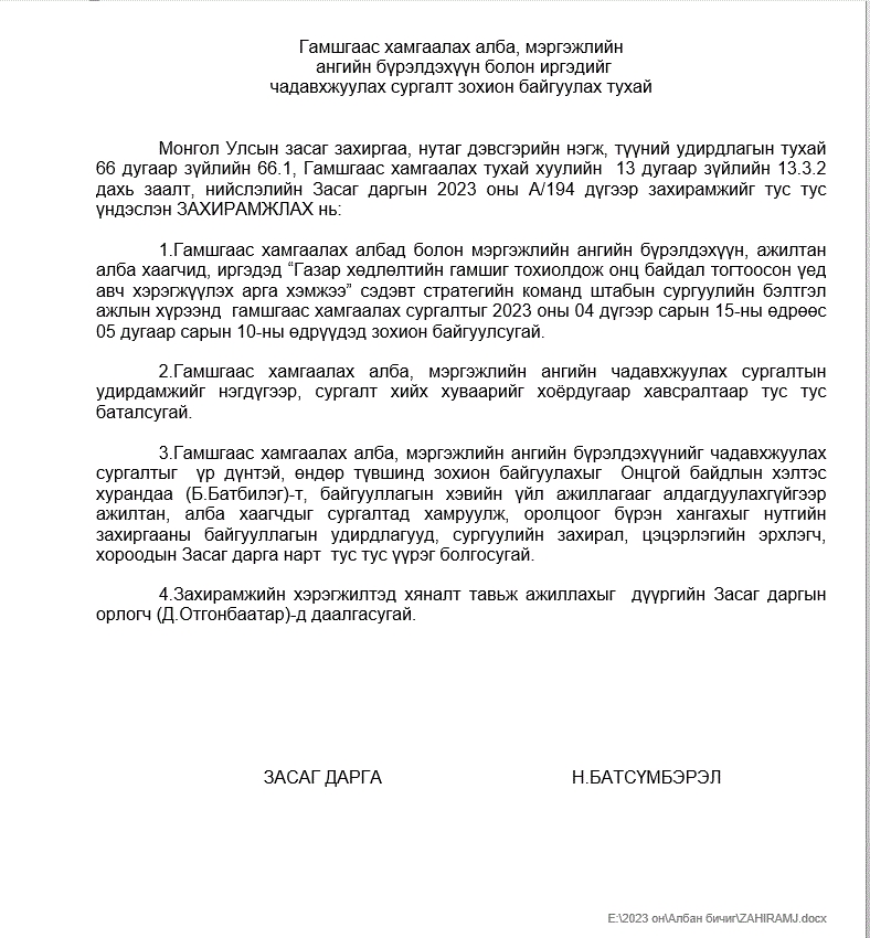Гамшгаас хамгаалах алба, мэргжлийн ангийн бүрэлдэхүүн болон иргэдийг чадавхжуулах сургалт зохион байгуулах тухай