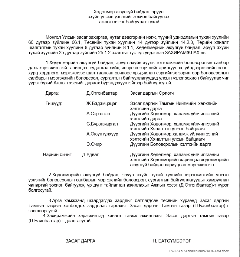 Хөдөлмөр аюулгүй байдал, эрүүл ахуйн улсын үзлэгийг зохион байгуулах ажлын хэсэг байгуулах тухай