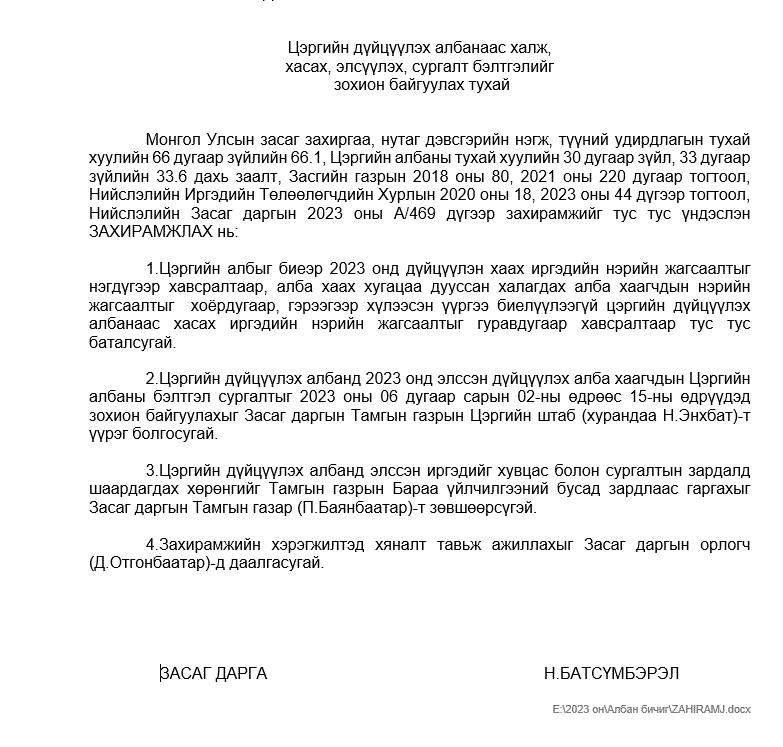 Цэргийн дүйцүүлэх албанаас халж, хасах, элсүүлэх, сургалт бэлтгэлийг зохион байгуулах тухай
