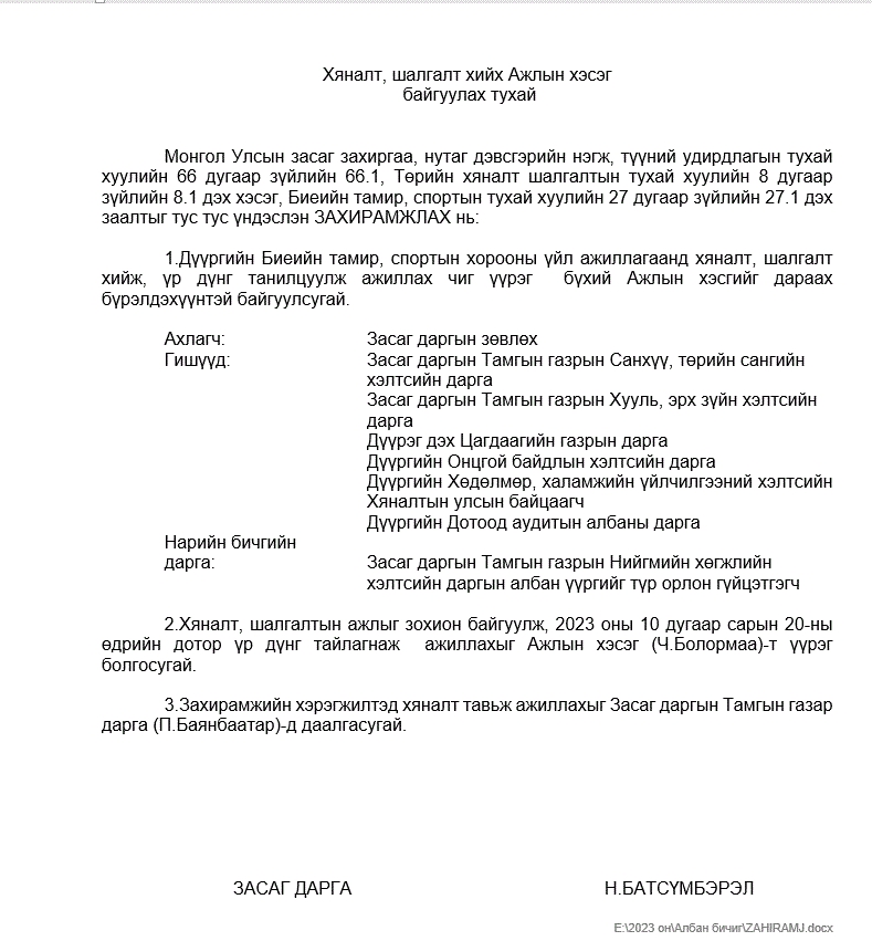 Хяналт, шалгалт хийх Ажлын хэсэг байгуулах тухай