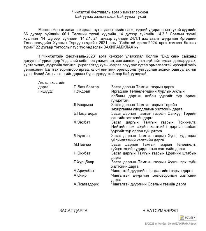 ЧИНГЭЛТЭЙ ФЕСТИВАЛЬ АРГА ХЭМЖЭЭГ ЗОХИОН БАЙГУУЛАХ АЖЛЫН ХЭСЭГ БАЙГУУЛАХ ТУХАЙ