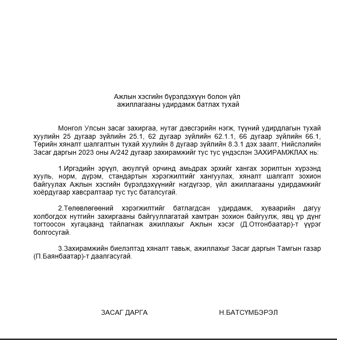 АЖЛЫН ХЭСГИЙН БҮРЭЛДЭХҮҮН БОЛОН ҮЙЛ АЖИЛЛАГААНЫ УДИРДАМЖ БАТЛАХ ТУХАЙ