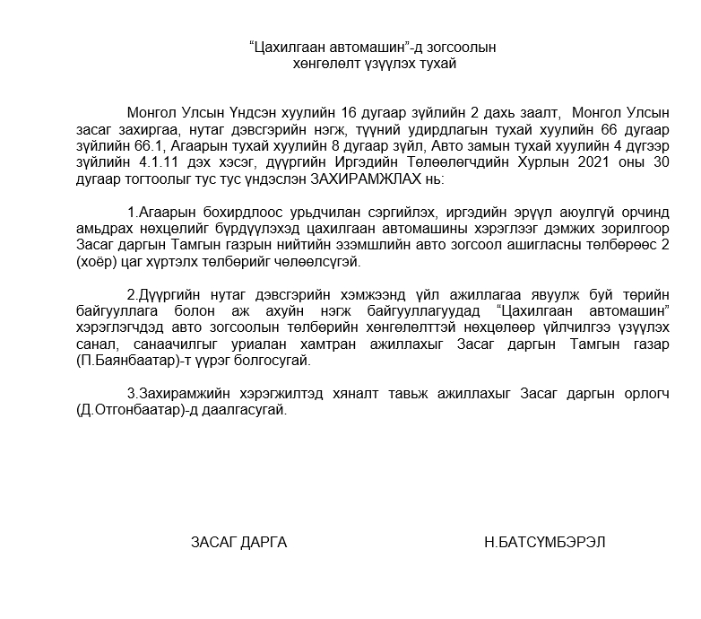 "ЦАХИЛГААН АВТОМАШИН"-Д ЗОГСООЛЫН ХӨНГӨЛӨЛТ ҮЗҮҮЛЭХ ТУХАЙ