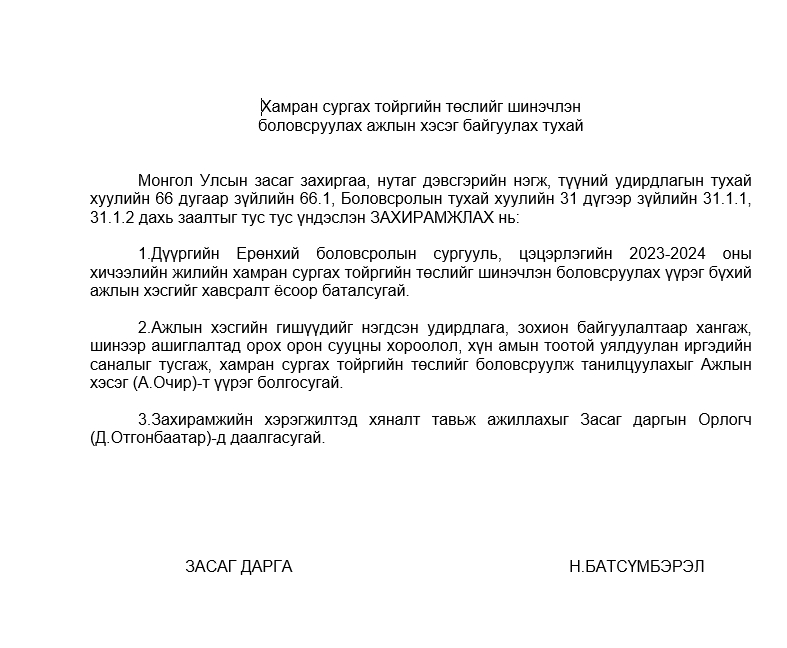 ХАМРАН СУРГАХ ТОЙРГИЙН ТӨСЛИЙГ ШИНЭЧЛЭН БОЛОВСРУУЛАХ АЖЛЫН ХЭСЭГ БАЙГУУЛАХ ТУХАЙ