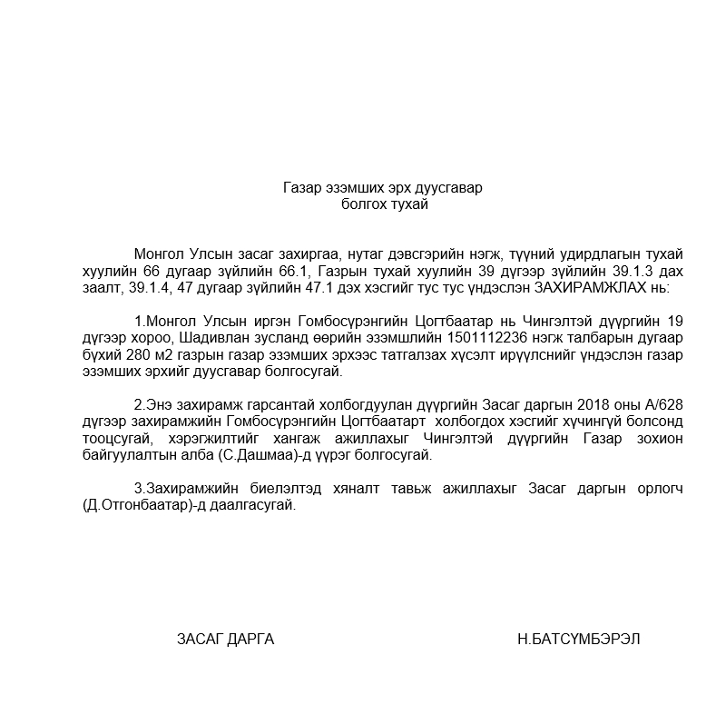 ГАЗАР ЭЗЭМШИХ ЭРХ ДУУСГАВАР БОЛГОХ ТУХАЙ