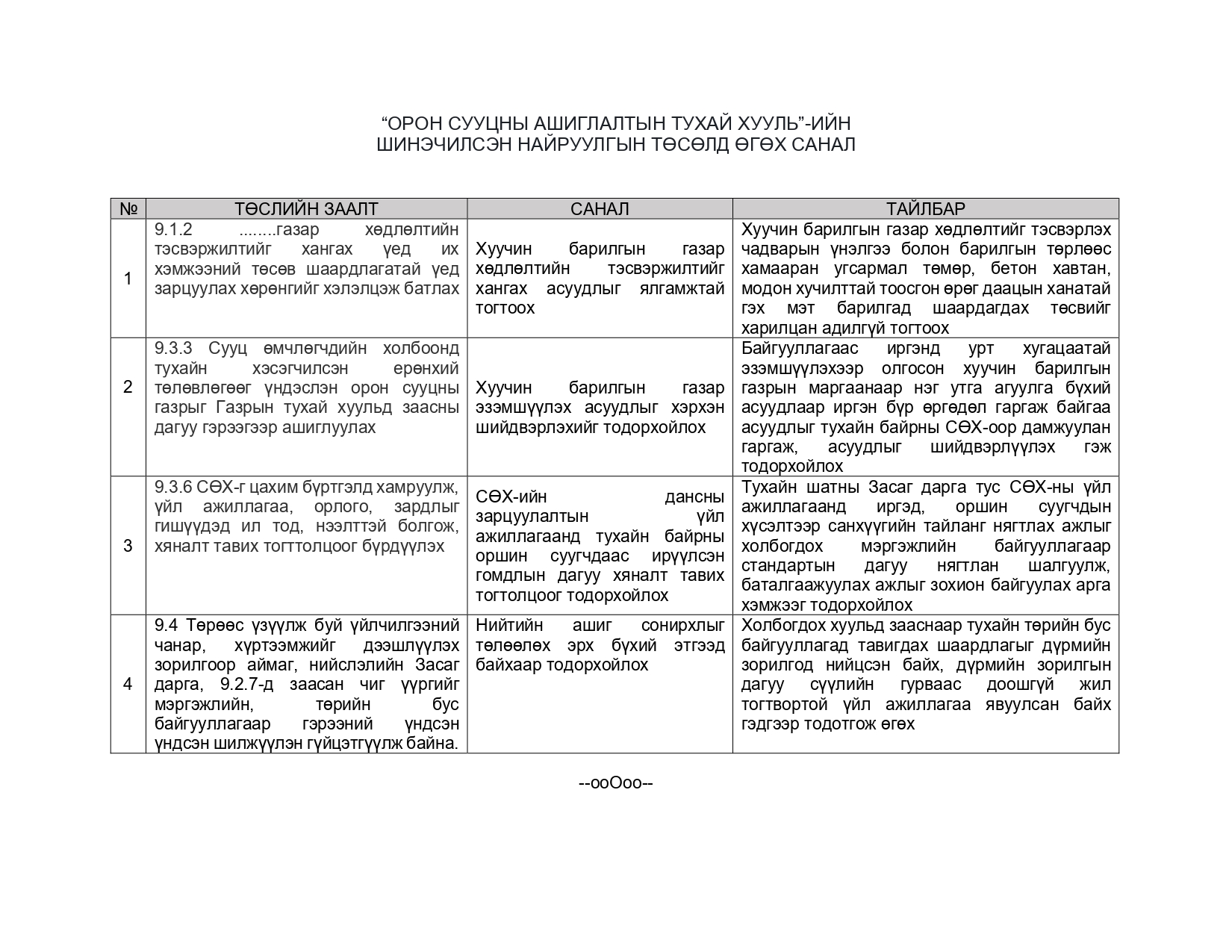 “ОРОН СУУЦНЫ АШИГЛАЛТЫН ТУХАЙ ХУУЛЬ”-ИЙН ШИНЭЧИЛСЭН НАЙРУУЛГЫН ТӨСӨЛД ӨГӨХ САНАЛ