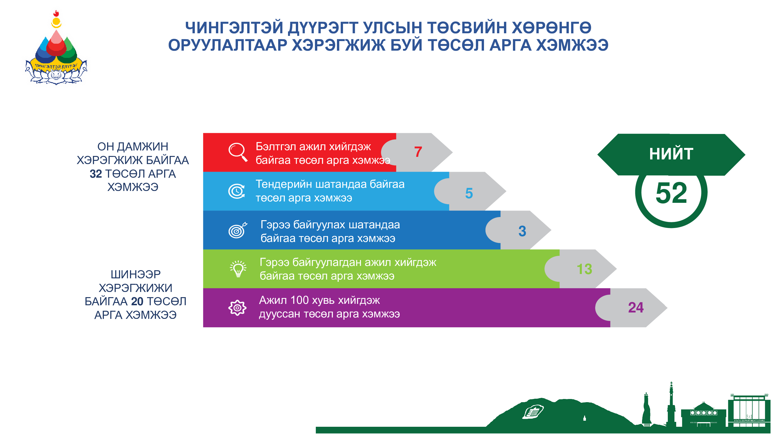 ЧИНГЭЛТЭЙ ДҮҮРЭГТ УЛСЫН ТӨСВИЙН ХӨРӨНГӨ ОРУУЛАЛТААР ХЭРЭГЖИЖ БУЙ ТӨСӨЛ АРГА ХЭМЖЭЭ