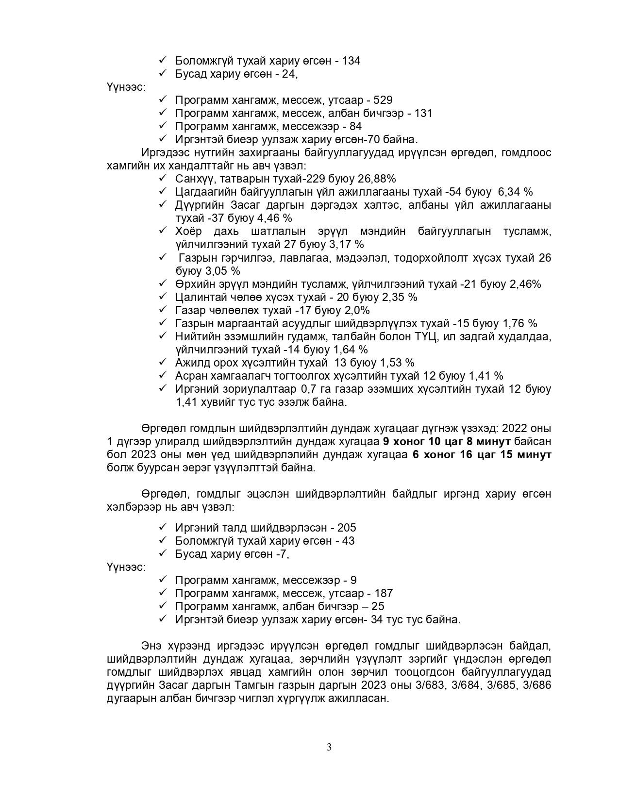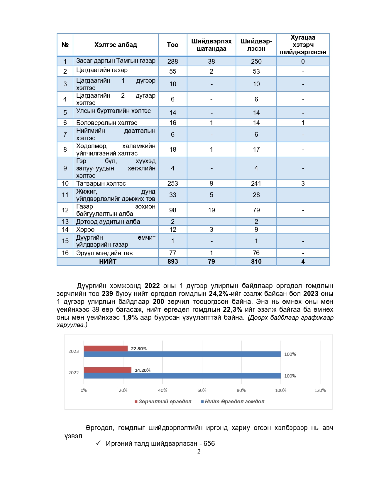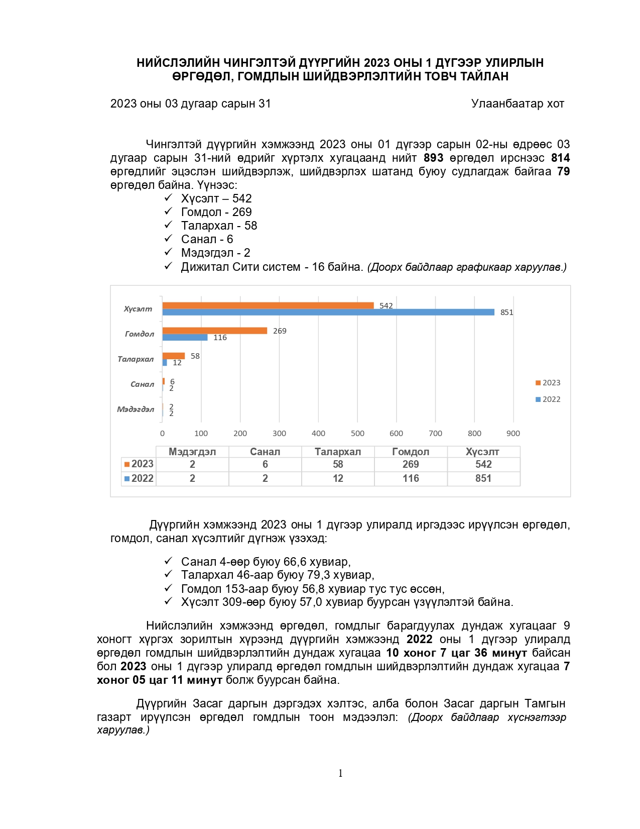 НИЙСЛЭЛИЙН ЧИНГЭЛТЭЙ ДҮҮРГИЙН 2023 ОНЫ 1 ДҮГЭЭР УЛИРЛЫН ӨРГӨДӨЛ, ГОМДЛЫН ШИЙДВЭРЛЭЛТИЙН ТОВЧ ТАЙЛАН