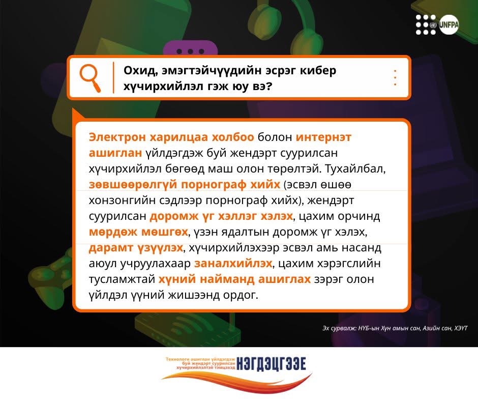 Технологи ашиглан үйлдэгдэж буй жендэрт суурилсан хүчирхийлэлтэй тэмцэхэд НЭГДЭЦГЭЭЕ!