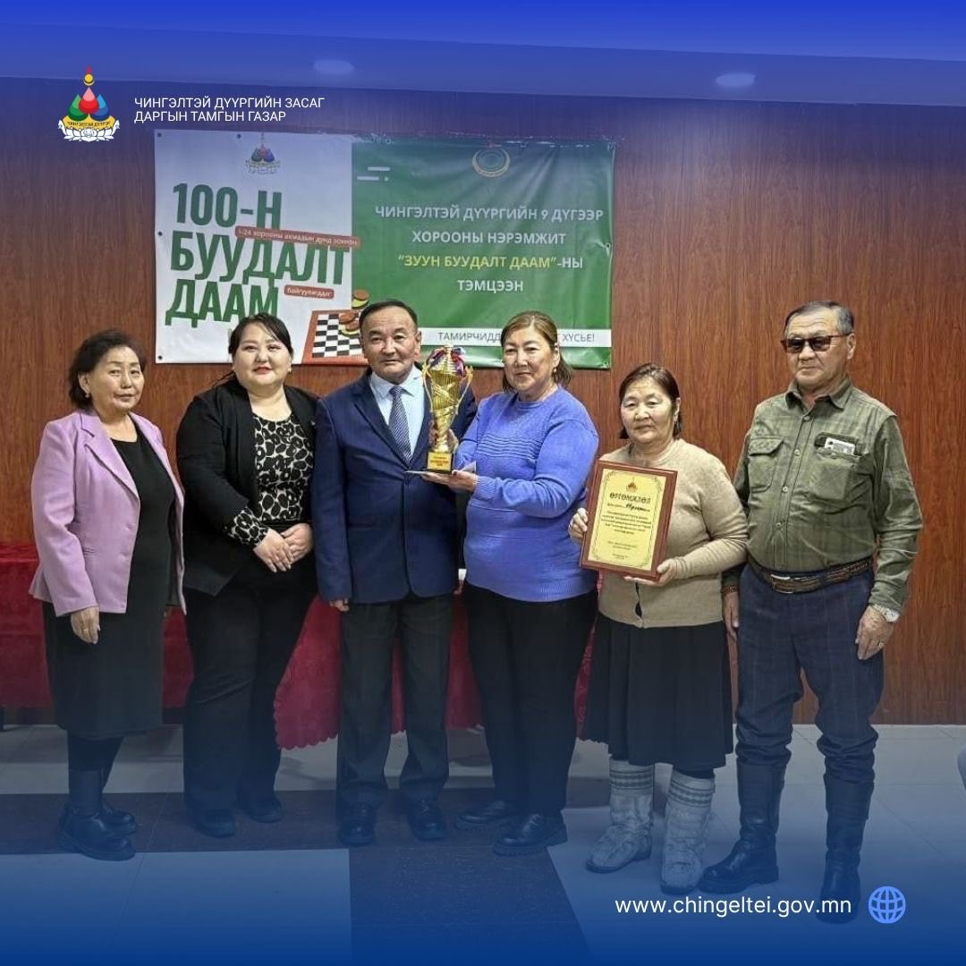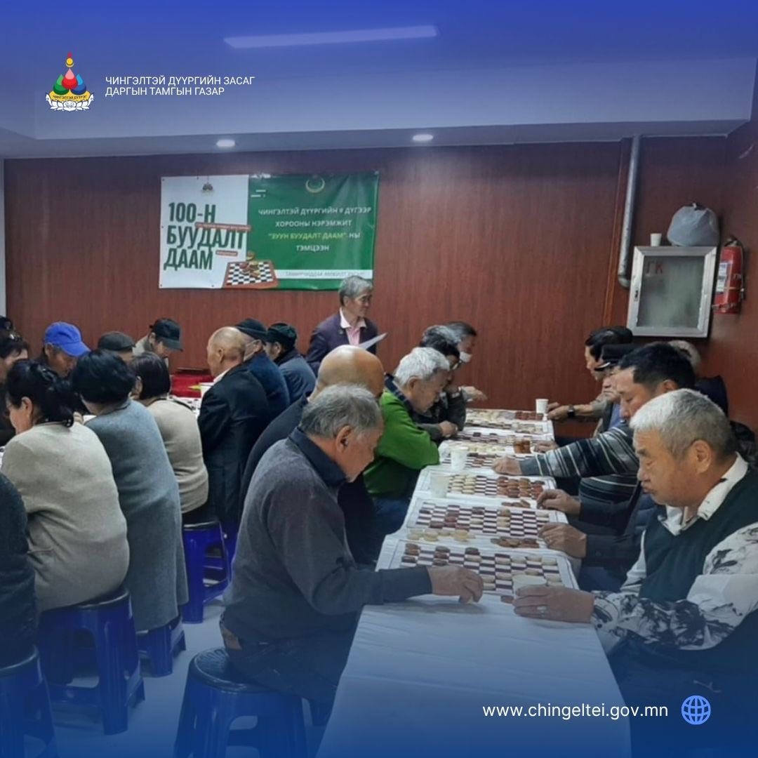 Чингэлтэй дүүргийн 9 дүгээр хорооны нэрэмжит Ахмадын зуун буудалт даамны аварга шалгаруулах тэмцээнийг зохион байгууллаа. Тэмцээнд 22 хорооны 40 тамирчин оролцож, оюуны спортын шигтгээ болсон 100 буудалт даамаар өрсөлдсөнөөс