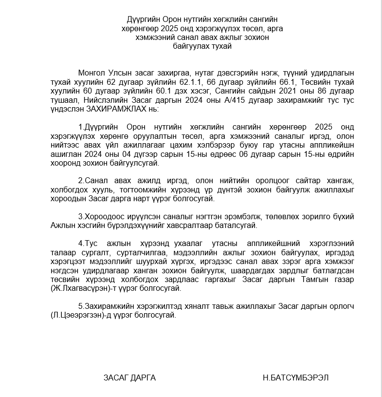 Дүүргийн Орон нутгийн хөгжлийн сангийн хөрөнгөөр 2025 онд хэрэгжүүлэх төсөл, арга хэмжээний санал авах ажлыг зохион байгуулах тухай