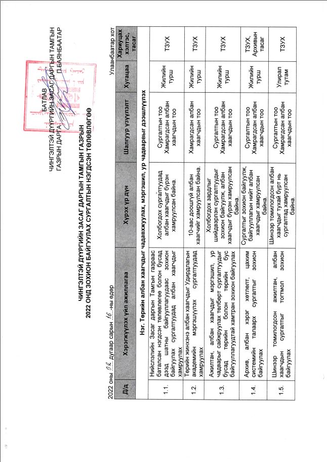 Чингэлтэй дүүргийн Засаг даргын Тамгын газрын 2022 онд зохион байгуулах сургалтын нэгдсэн төлөвлөгөө