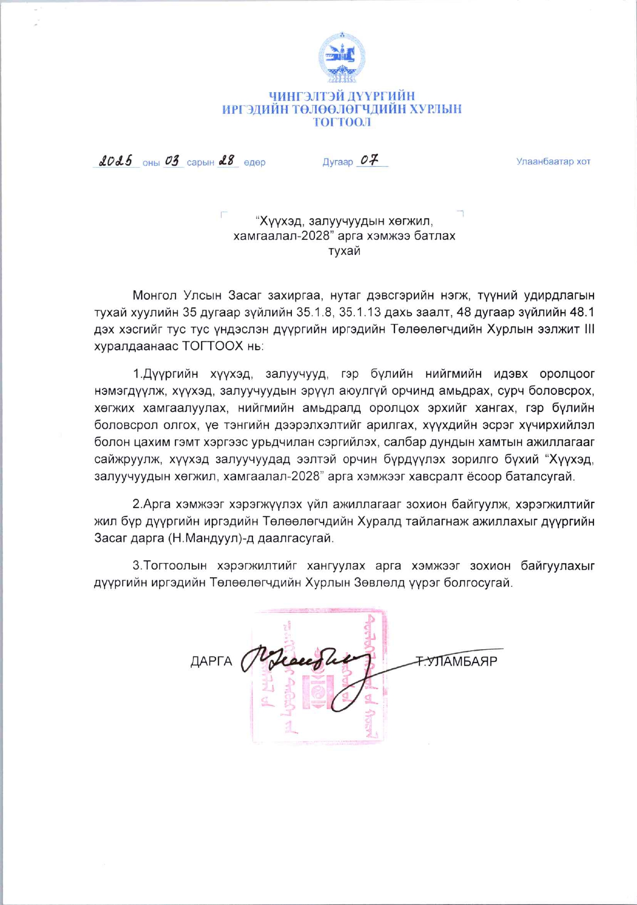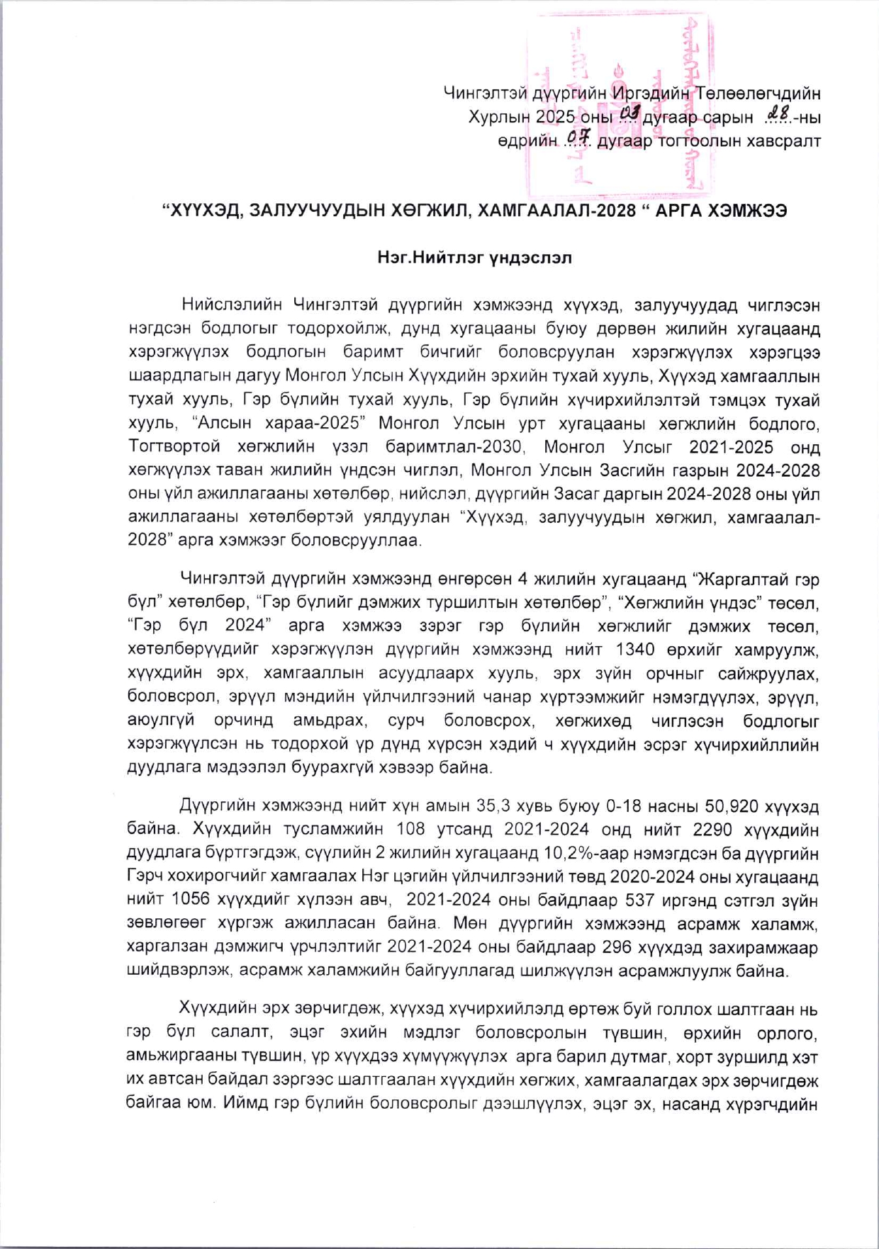 Хүүхэд залуучуудын хөгжил, хамгаалал 2028 арга хэмжээ
