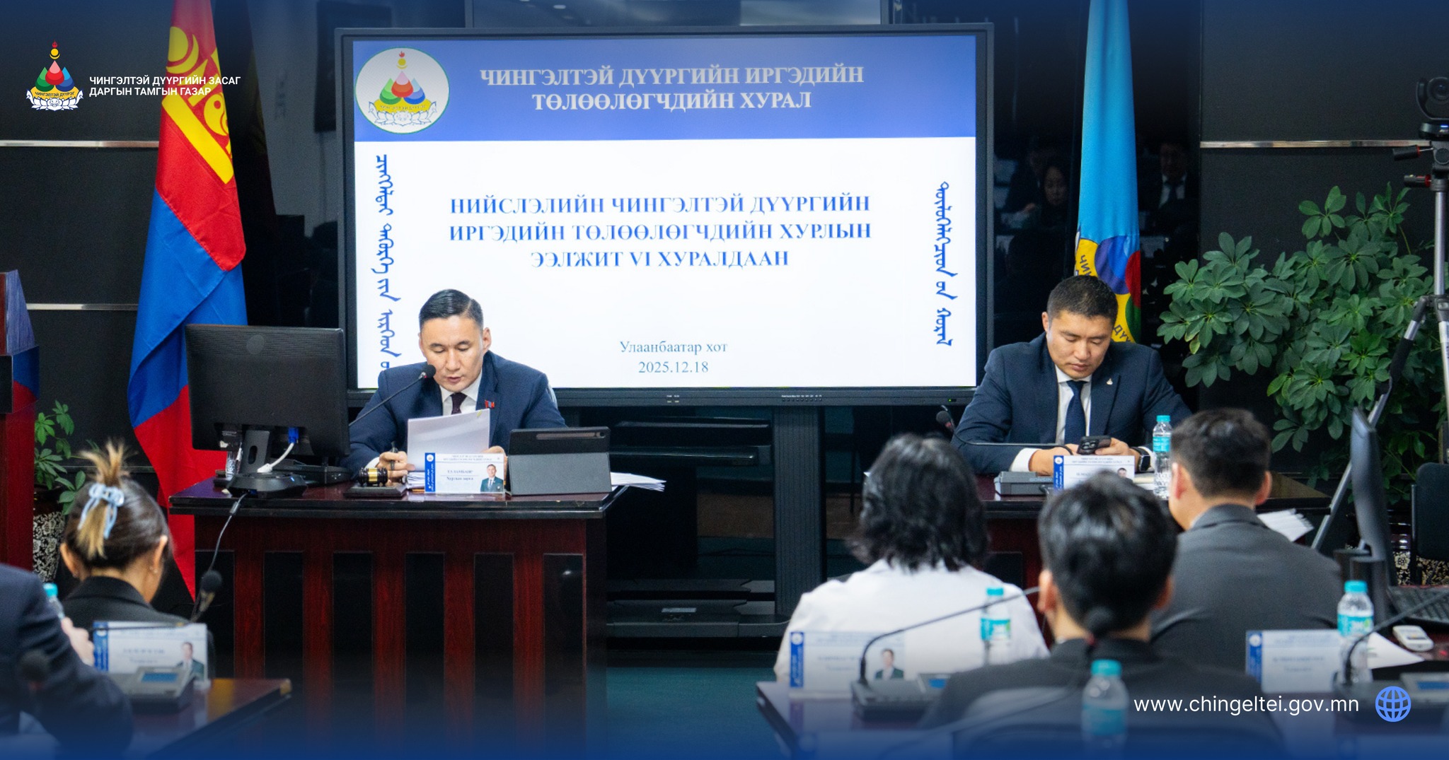 Чингэлтэй дүүргийн Иргэдийн Төлөөлөгчдийн Хурлын ээлжит VI хуралдаанаар 2026 оны төсвийг баталж, дэд бүтэц, байгаль орчин, нийгмийн үйлчилгээ, иргэдийн амьжиргааг дэмжих олон чухал ажлыг хэрэгжүүлэхээр төлөвлөлөө.