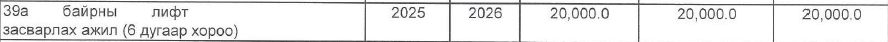 ТЕНДЕР ШАЛГАРУУЛАЛТЫН НЭР: ЧИНГЭЛТЭЙ ДҮҮРГИЙН 6 ДУГААР ХОРООНЫ 39A ДУГААР БАЙРНЫ ЛИФТ ЗАСВАРЫН АЖИЛ